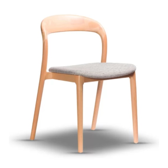 Delikatnie zaokrąglone i profilowane oparcie krzesła zapewnia wygodne podparcie pleców. Solidna drewniana konstrukcja gwarantuje trwałość, a tapicerowane siedzisko dodaje mu miękkości i komfortu.