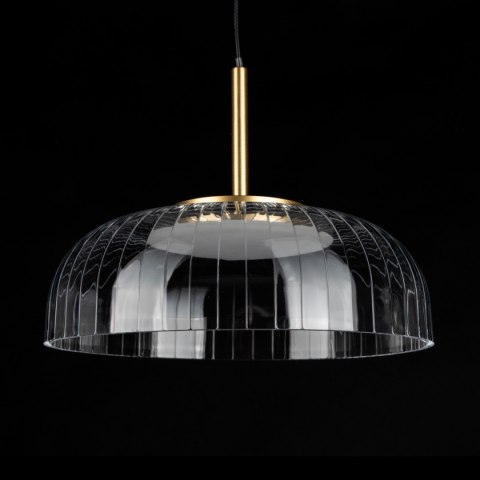 Ponadczasowy design tej pięknej lampy wyrażony jest w detalach: prostym , akrylowym abażurze delikatnie zdobionym prostymi liniami, satynowo-złotej rozecie i czarnych dodatkach. Całość lampy jest lekka i delikatna, ale jednocześnie trwała i bezpieczna w użytkowaniu.