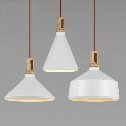 Skandynawska lampa wisząca o dwukolorowej biało - drewnianej konstrukcji.