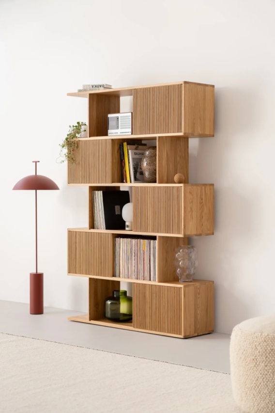 Charakterystycznym elementem regału są przesuwne fronty wykonane z ręcznie przygotowanych drewnianych listew, umieszczone po obu stronach konstrukcji. Pozwalają one swobodnie regulować stopień otwartości półek i niezależnie aranżować każdą stronę mebla, dopasowując go do funkcji danej przestrzeni.