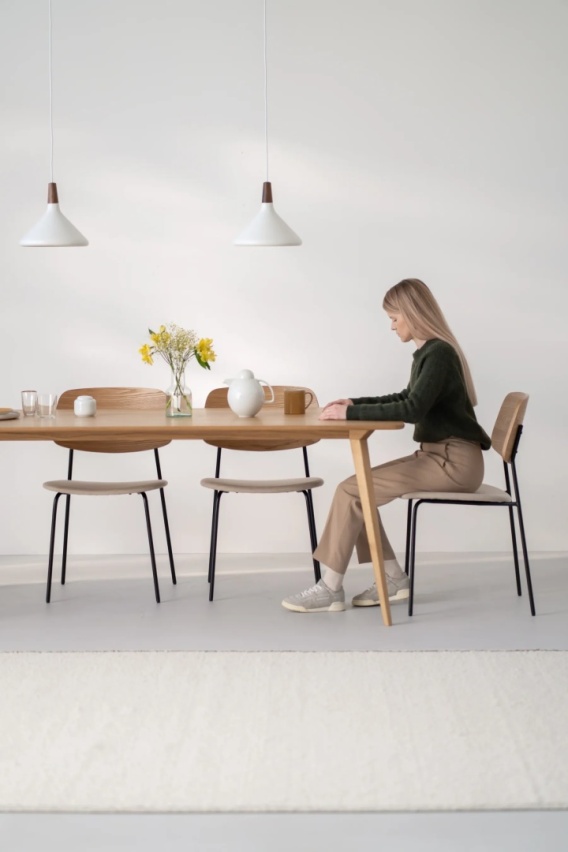 Prostokątny blat zachowuje klasyczne, funkcjonalne proporcje. Delikatnie zaokrąglone narożniki oraz subtelnie wyprofilowane krawędzie łagodzą jego formę i tworzą spójną całość z prostą, zdecydowaną linią nóg. Dzięki temu stół prezentuje się harmonijnie i wizualnie lekko.